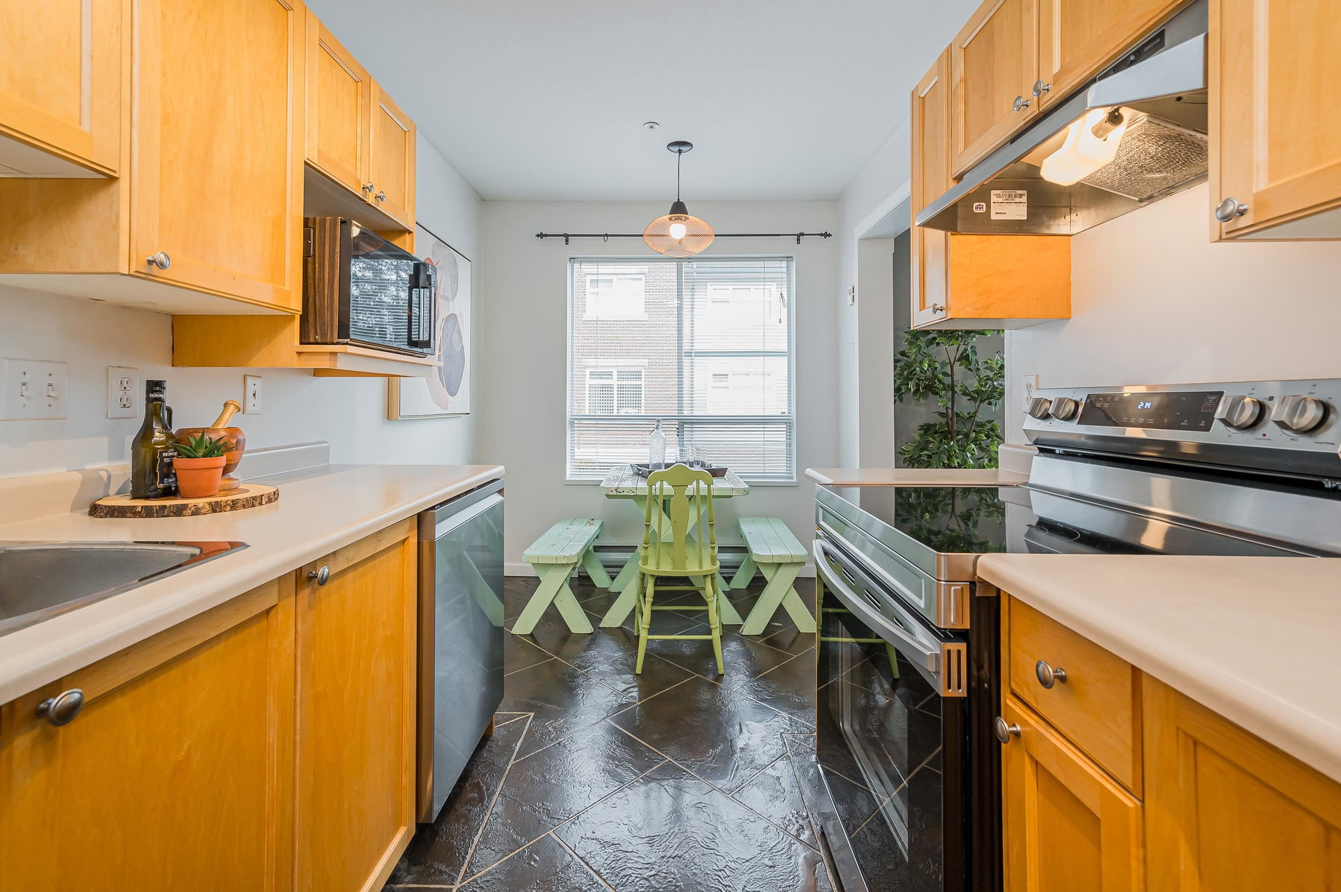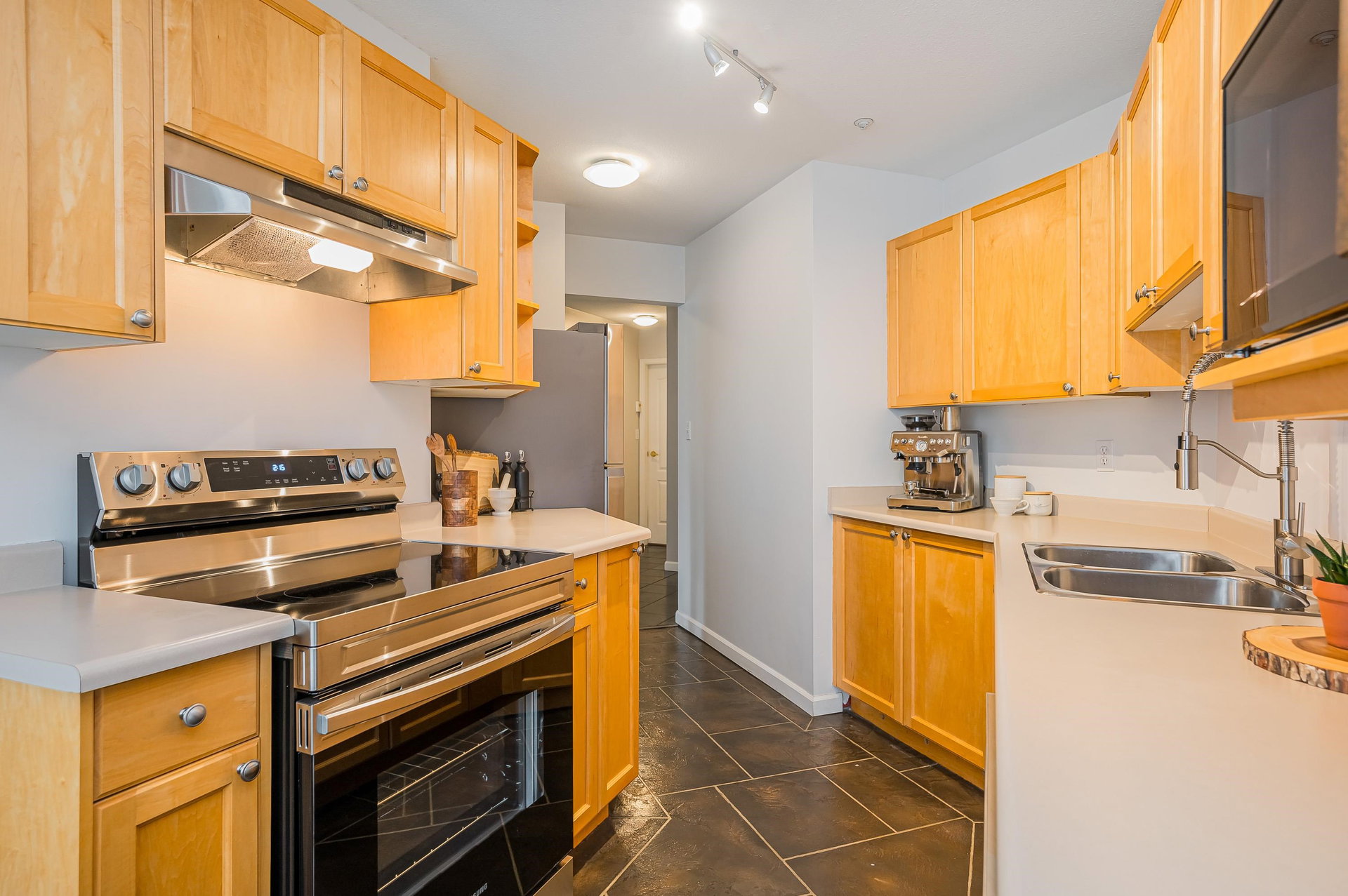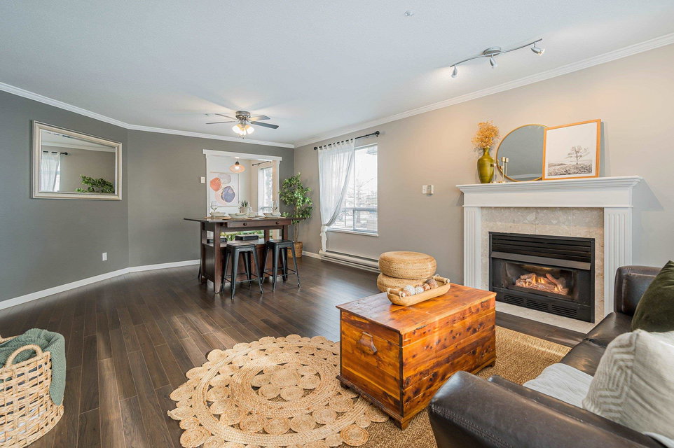 WELCOME HOME to this ABOVE GROUND 2 bed, 2 bath, bright & spacious CORNER UNIT. Located in the heart of Langley City and within walking distance to transit, shopping, recreation, schools and more, this home has been lovingly cared for and updated with flooring, brand new appliances, crown molding, paint and more. You will love the entryway into this unit leading to laundry room with lots of storage space, an open living room with freshly cleaned & serviced gas fireplace, spacious balcony off the living room, and an eat-in kitchen with large window. 1 covered parking stall & 1 storage locker. 1 cat or 1 dog permitted, max 13″.