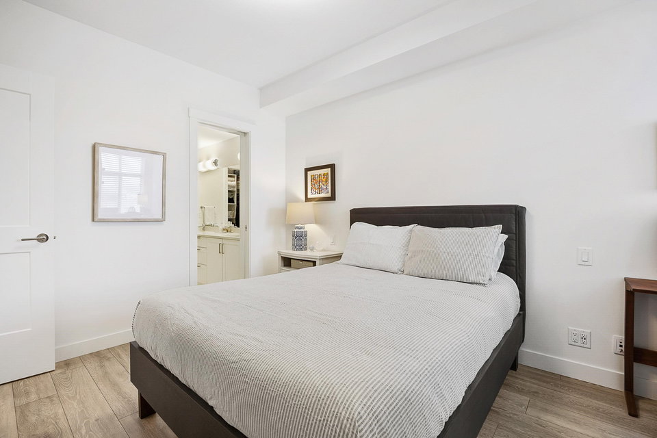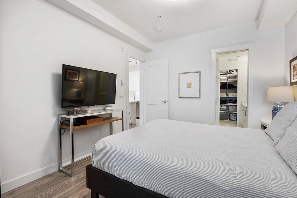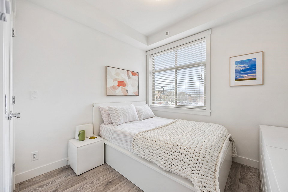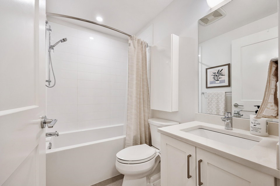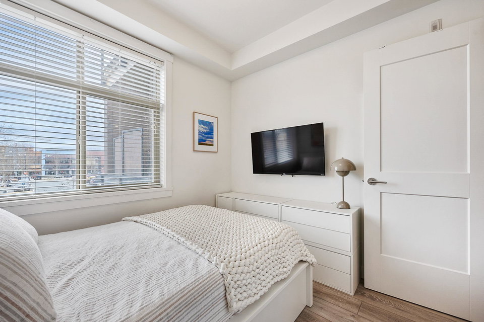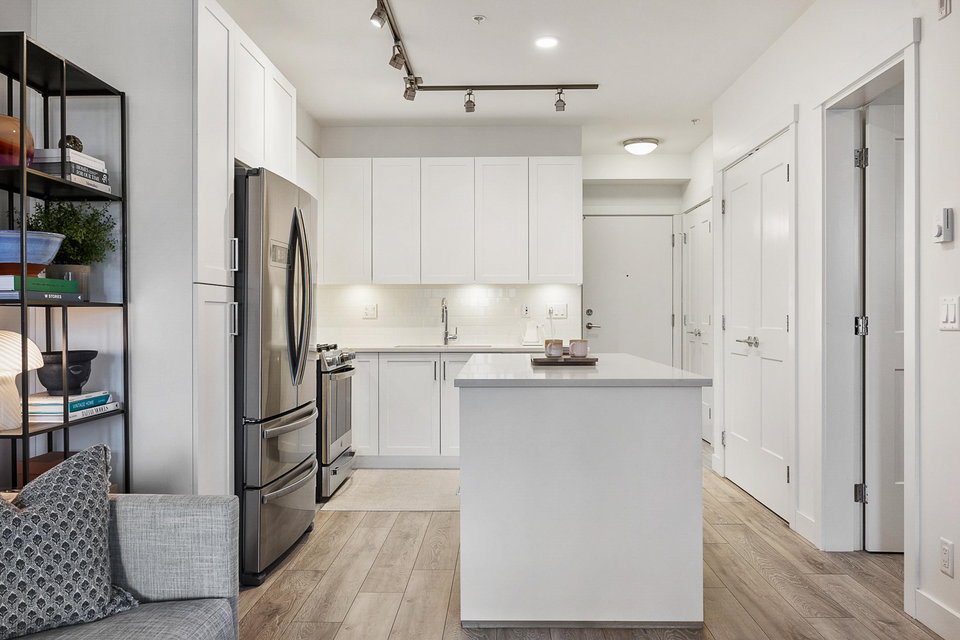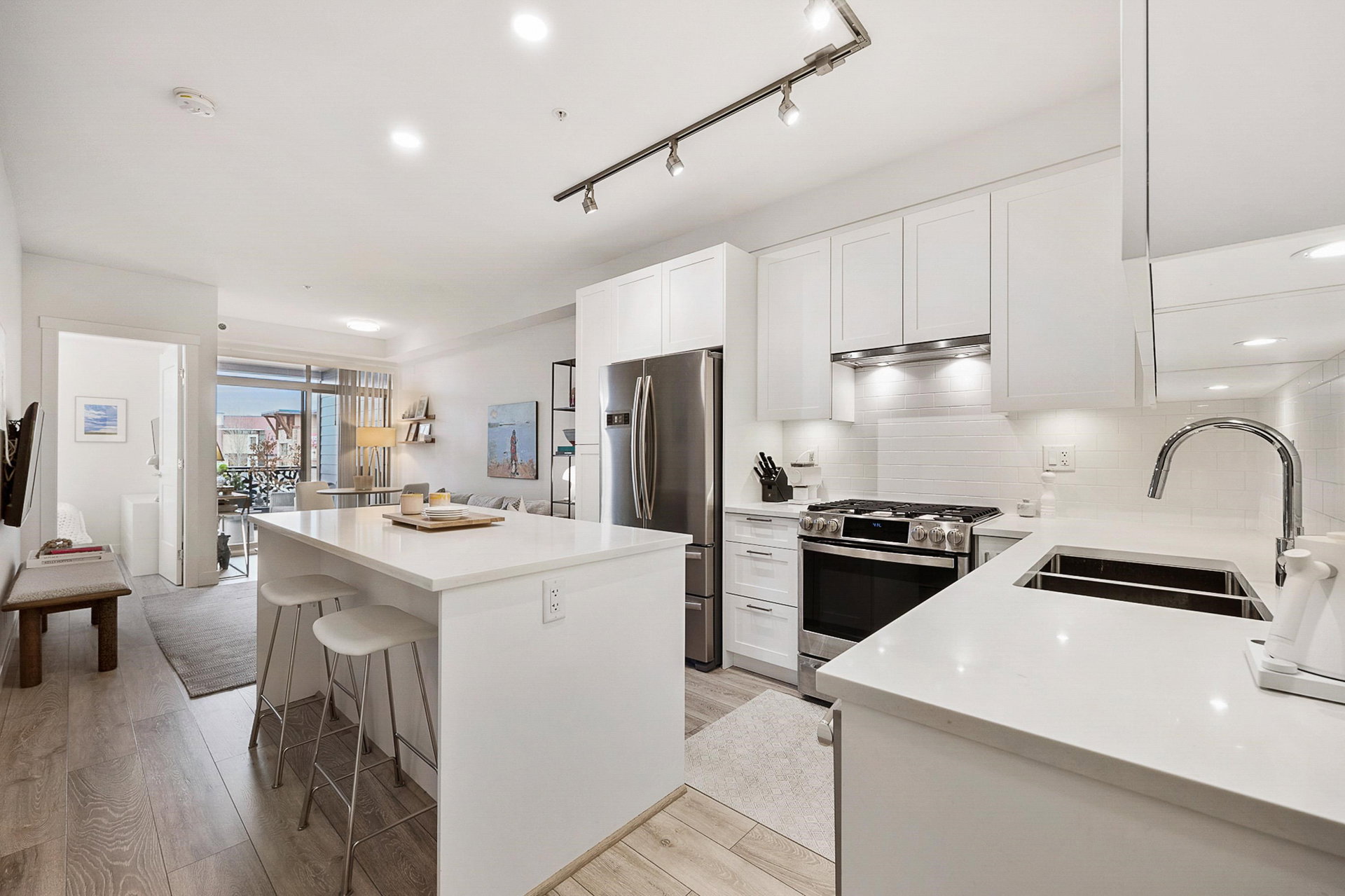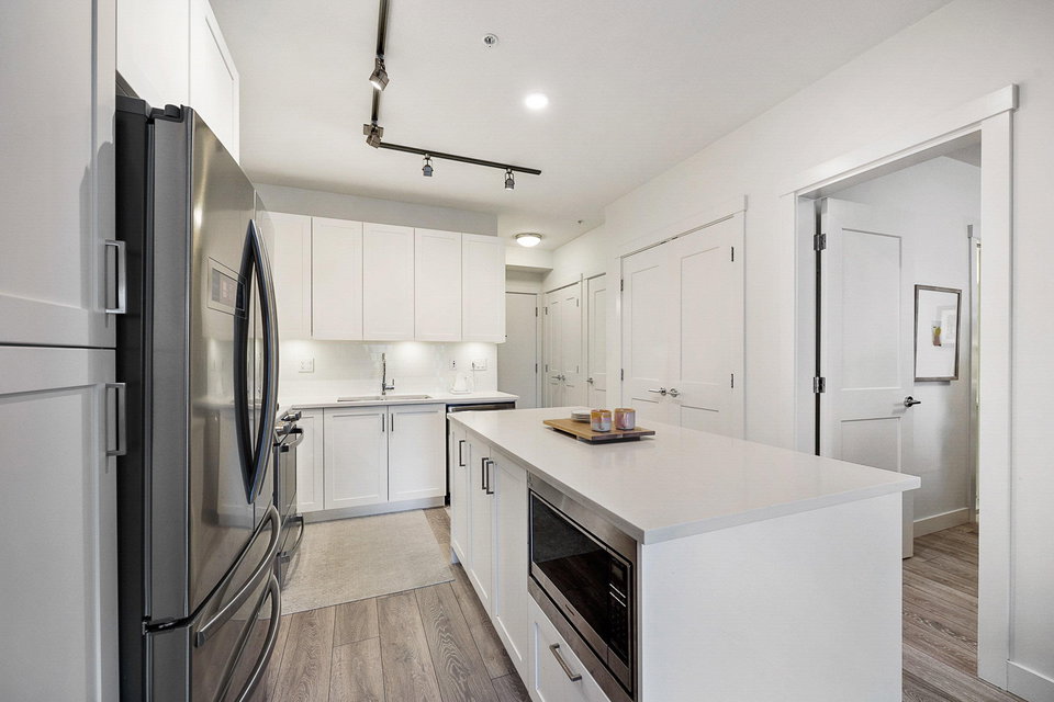 WELCOME to this 2 bed (window in both), 2 bath QUADRA luxury condo with 2 parking & spacious storage locker. This bright condo features 9′ ceilings, a full kitchen w/white shaker soft close cabinetry, tower pantry w/pull out drawers, quartz counter-tops & full height tile backsplash, island with integrated microwave, pull-out recycling bins & bar seating. SS appliance package including a GAS RANGE. Master bed features 4 piece luxury ensuite with 2 sinks and frameless glass shower plus a large walk-in closet. Laminate flooring throughout. Heated floor in baths. Large balcony with GAS BBQ outlet.All of this in an A+ location-connected to the Willoughby Town Centre, and walkable to school, transit, shops and more. Exercise room and playground plus common patio area.