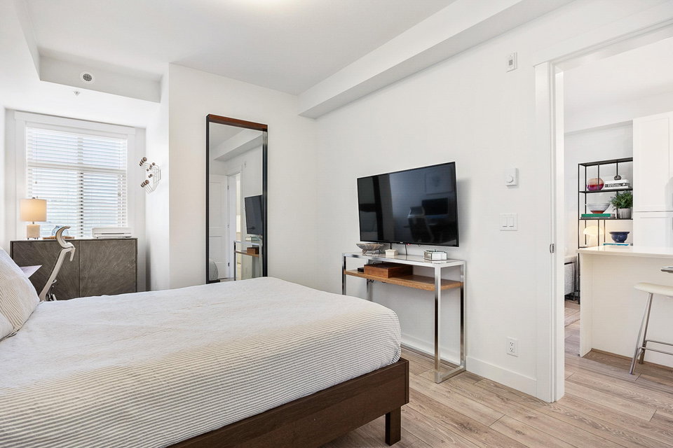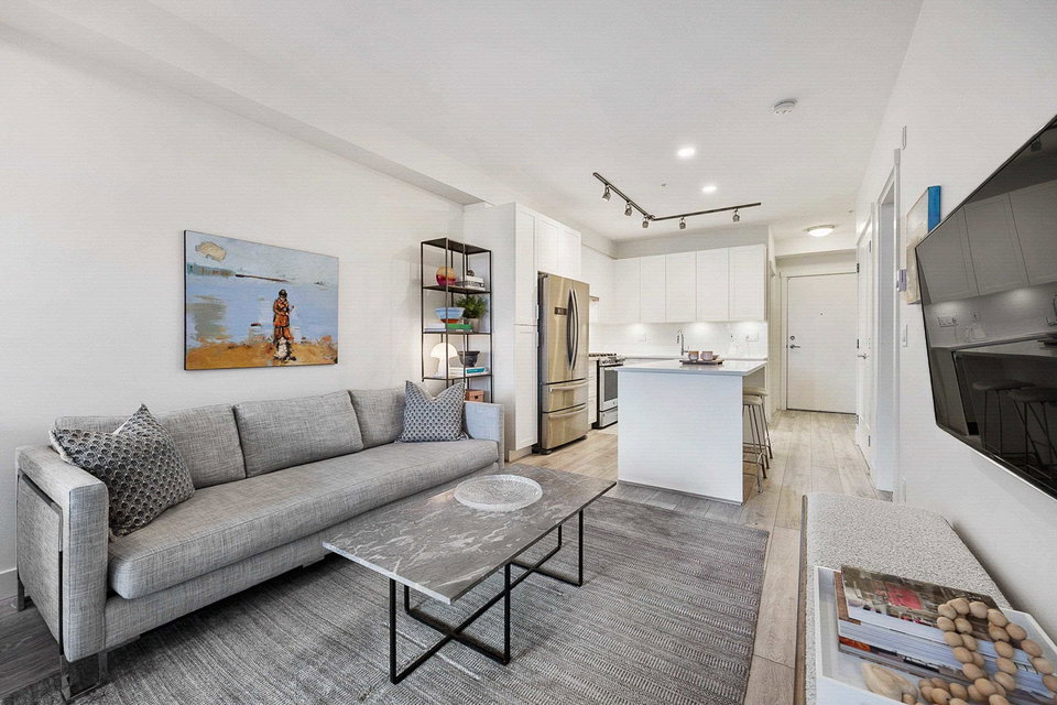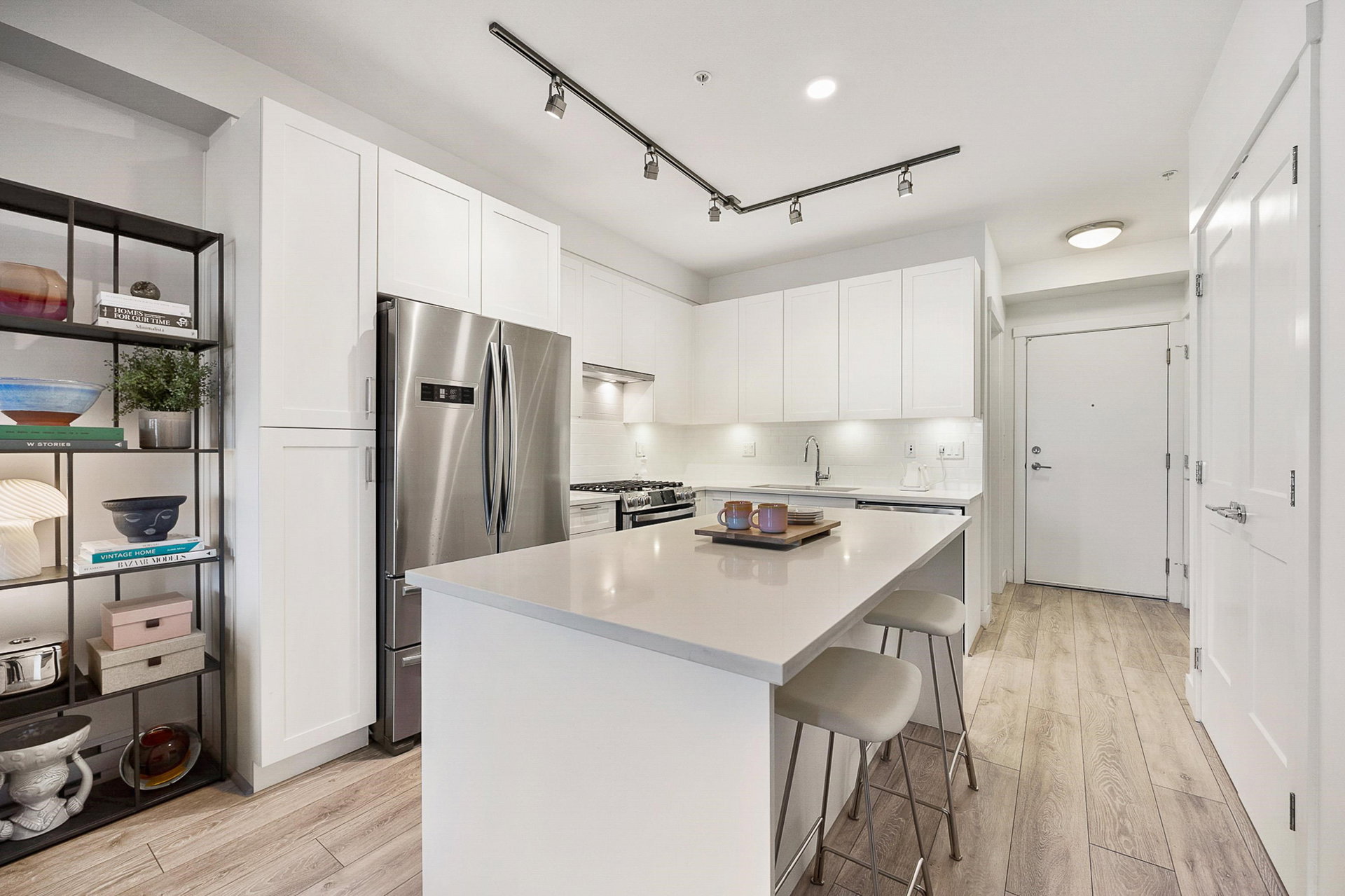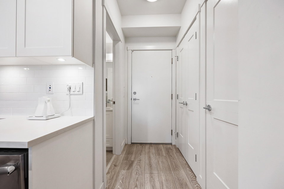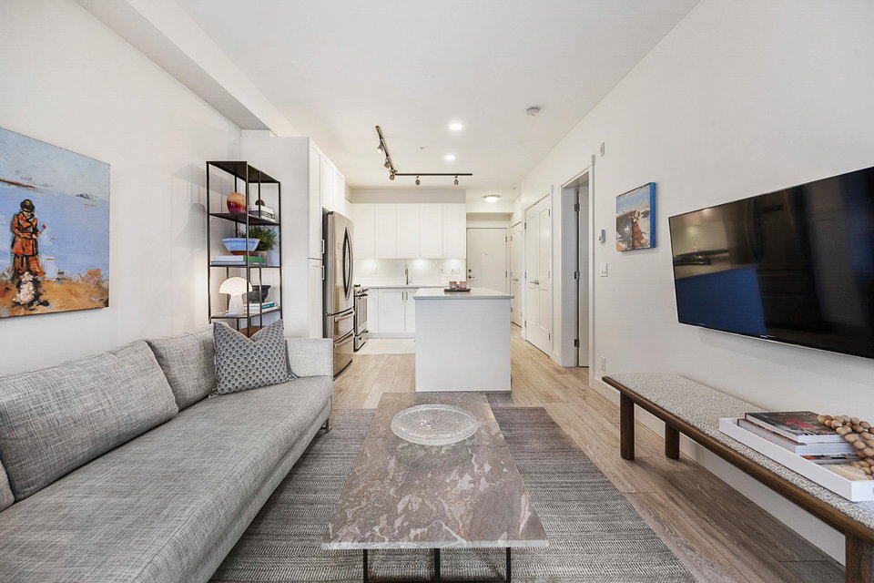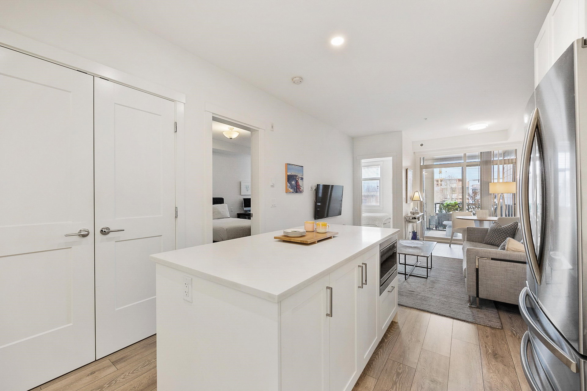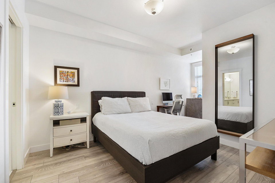 WELCOME to this 2 bed (window in both), 2 bath QUADRA luxury condo with 2 parking & spacious storage locker. This bright condo features 9′ ceilings, a full kitchen w/white shaker soft close cabinetry, tower pantry w/pull out drawers, quartz counter-tops & full height tile backsplash, island with integrated microwave, pull-out recycling bins & bar seating. SS appliance package including a GAS RANGE. Master bed features 4 piece luxury ensuite with 2 sinks and frameless glass shower plus a large walk-in closet. Laminate flooring throughout. Heated floor in baths. Large balcony with GAS BBQ outlet.All of this in an A+ location-connected to the Willoughby Town Centre, and walkable to school, transit, shops and more. Exercise room and playground plus common patio area.