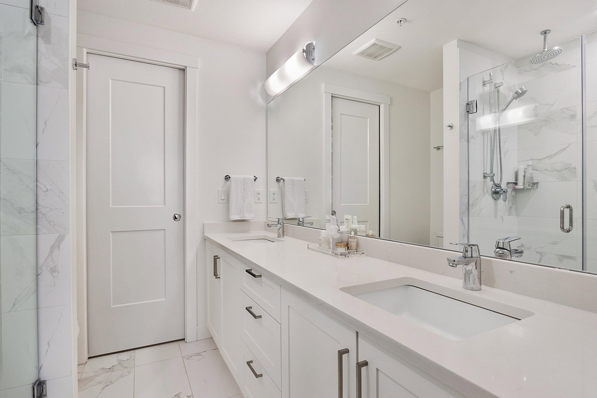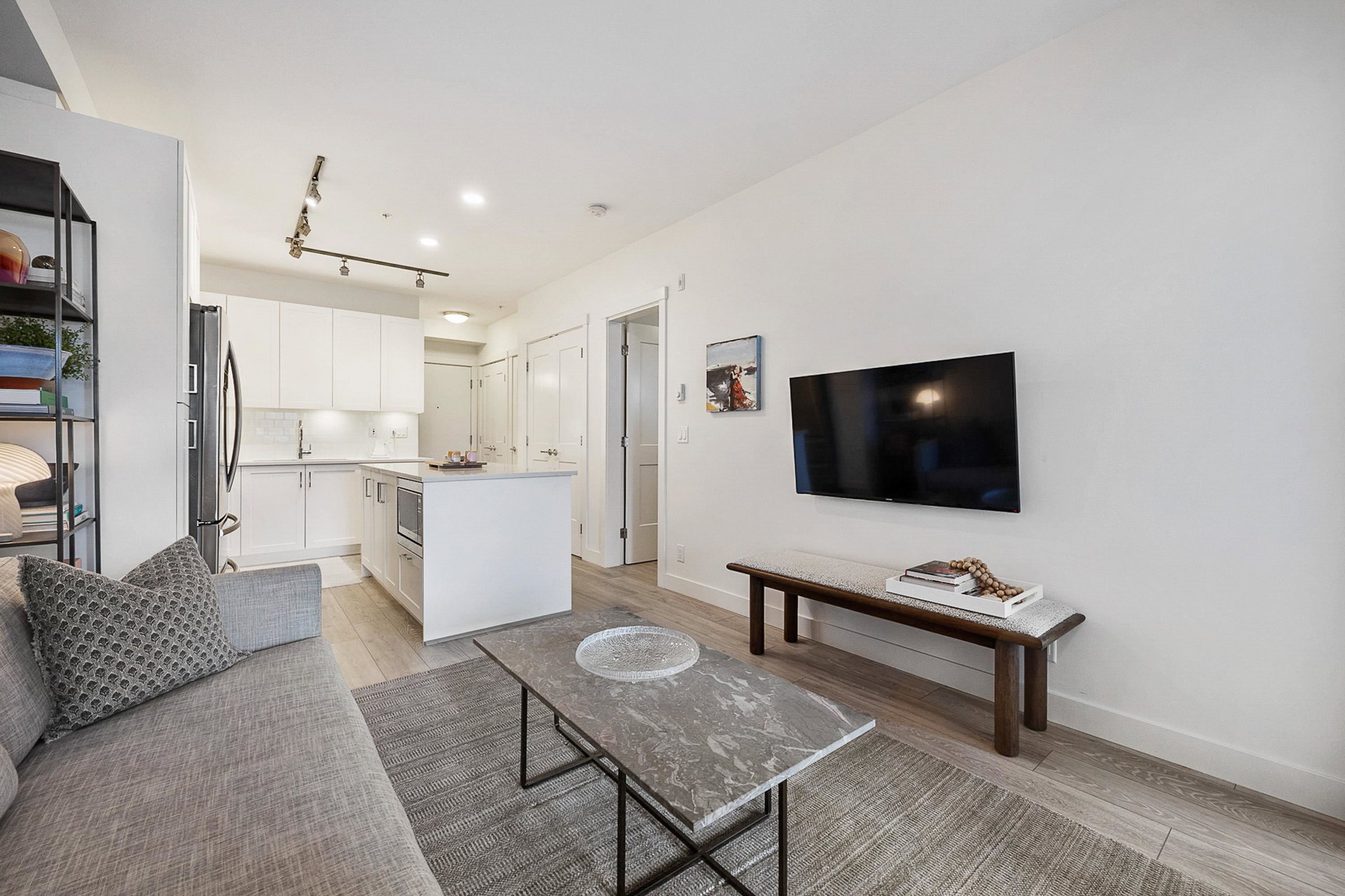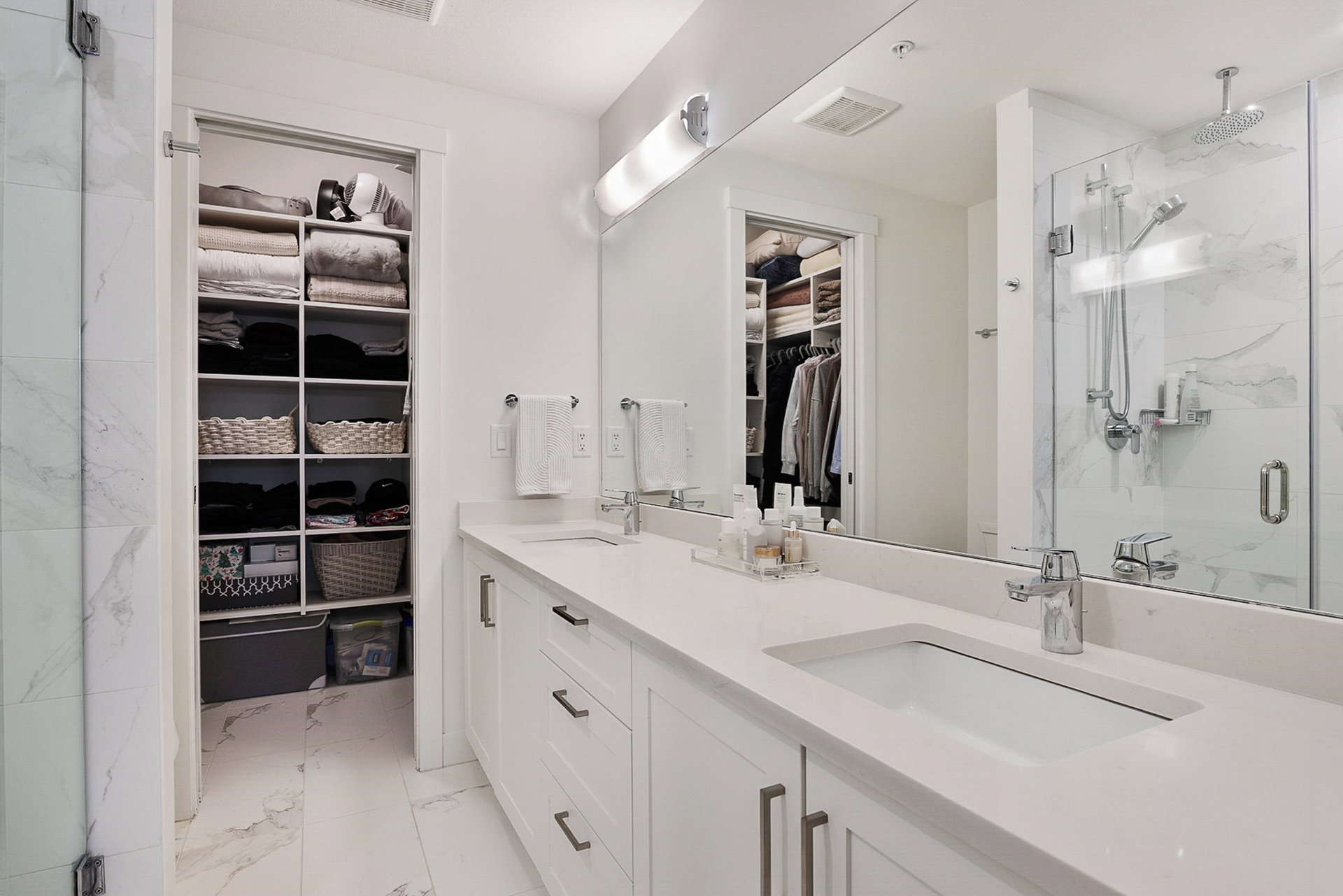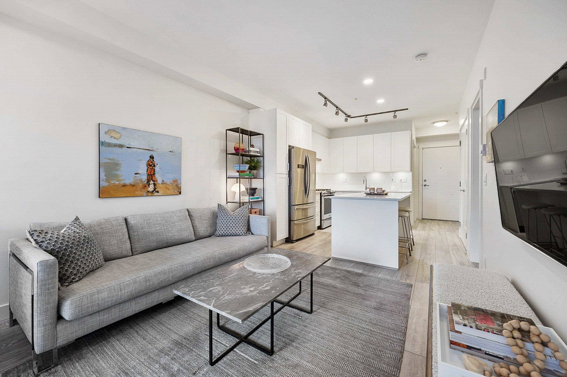 WELCOME to this 2 bed (window in both), 2 bath QUADRA luxury condo with 2 parking & spacious storage locker. This bright condo features 9′ ceilings, a full kitchen w/white shaker soft close cabinetry, tower pantry w/pull out drawers, quartz counter-tops & full height tile backsplash, island with integrated microwave, pull-out recycling bins & bar seating. SS appliance package including a GAS RANGE. Master bed features 4 piece luxury ensuite with 2 sinks and frameless glass shower plus a large walk-in closet. Laminate flooring throughout. Heated floor in baths. Large balcony with GAS BBQ outlet.All of this in an A+ location-connected to the Willoughby Town Centre, and walkable to school, transit, shops and more. Exercise room and playground plus common patio area.