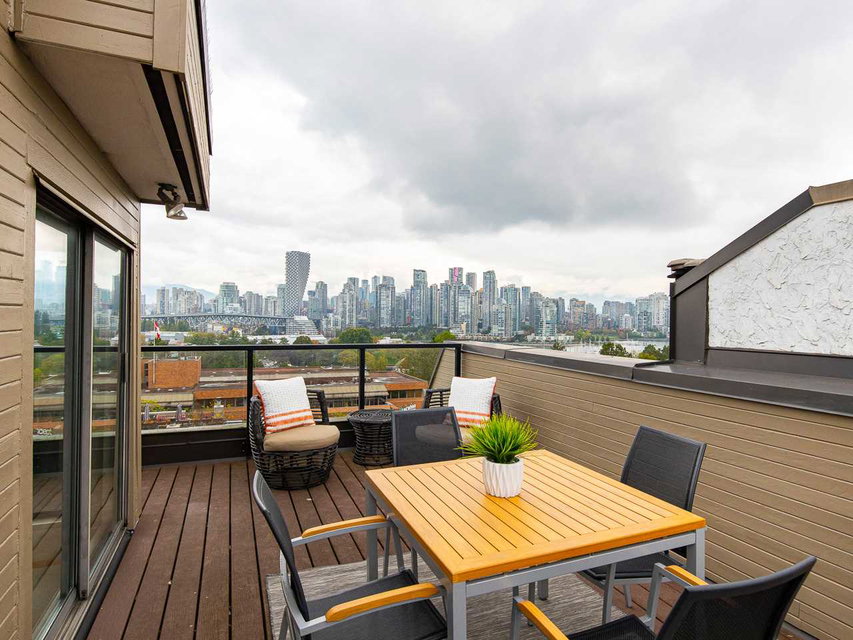 First time on the market in 30 years! This home checks off all the boxes. Penthouse with multiple balcony + Rooftop Deck? Yes. Over 1300 SQ.FT on one level with 3 bedrooms+ 2 bathrooms? Yes. Unobstructed panoramic city, mountain, and water views from your living space and rooftop deck? Check. Pro-active strata and rainscreened building ? Check. Just steps to shopping, restaurants, Granville Island, and transit including the newly approved skytrain station. Comes with 1 parking and 1 locker and lots of residential street parking.