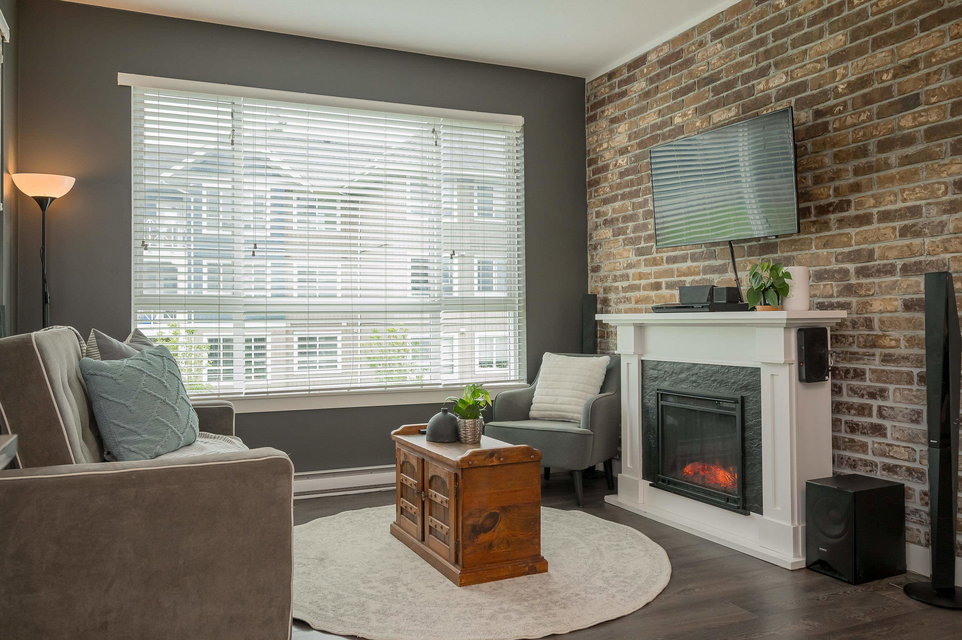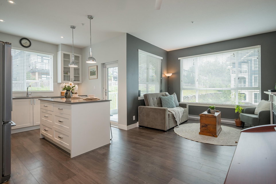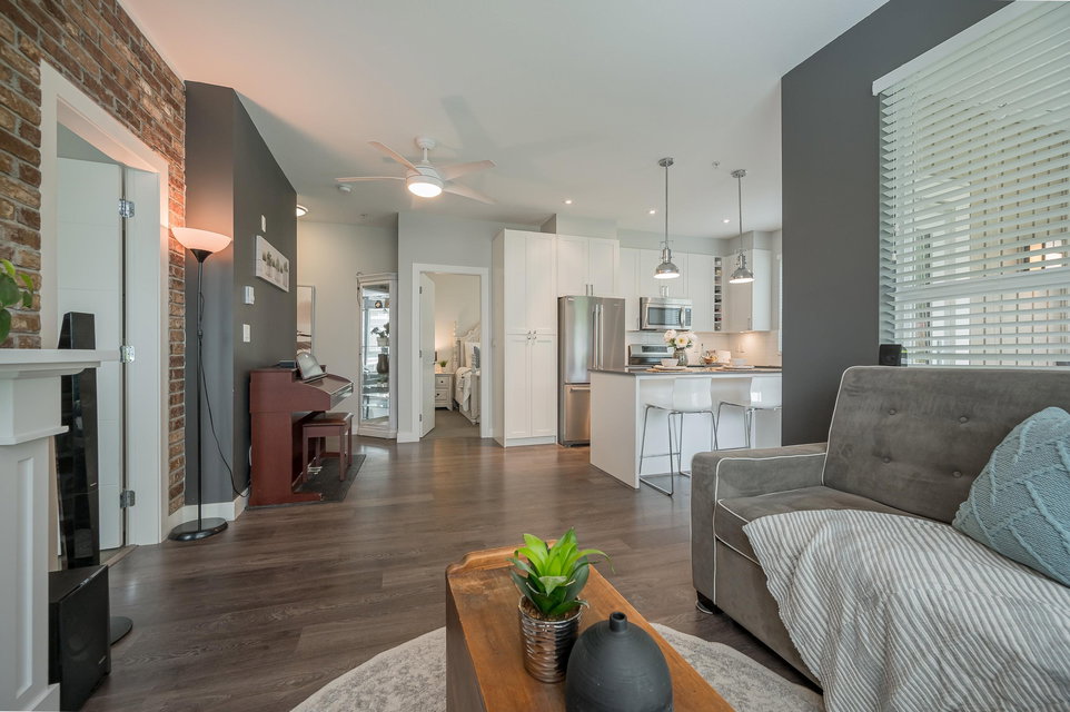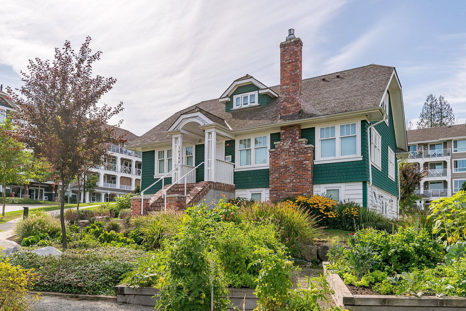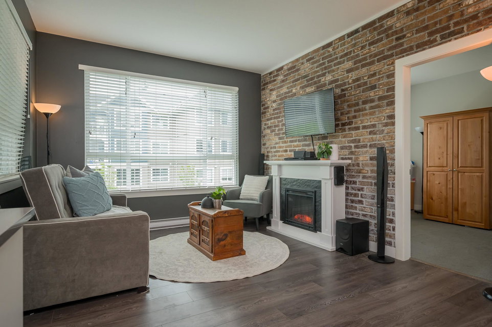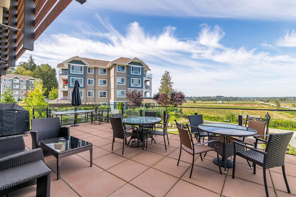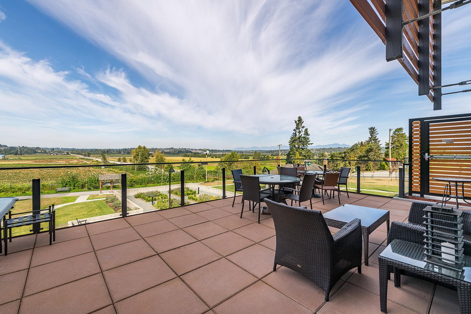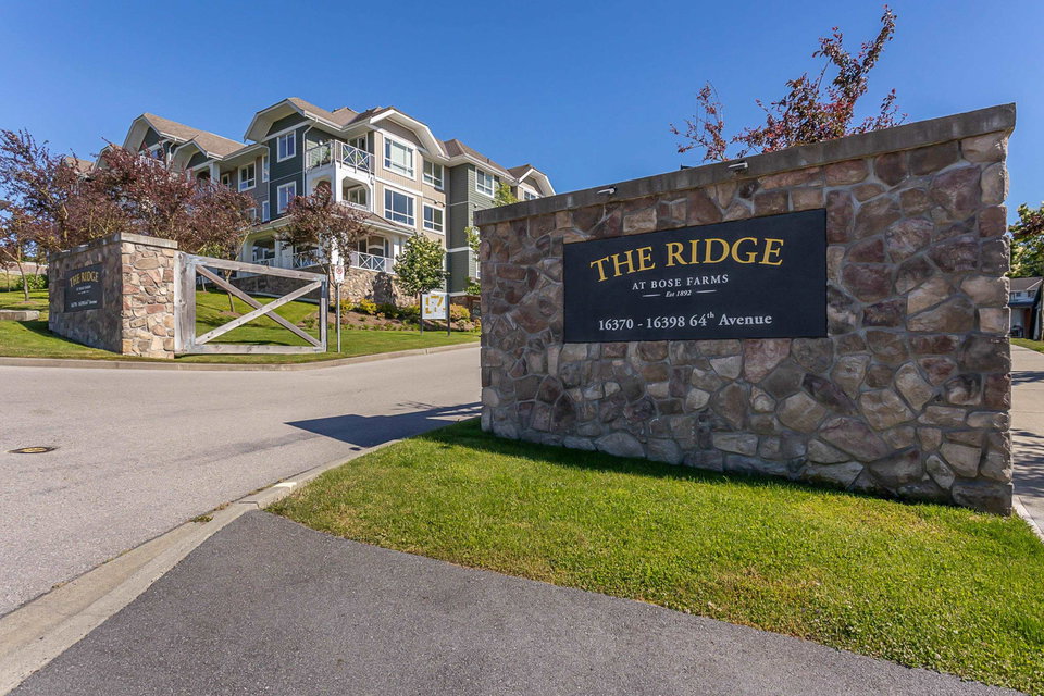WELCOME HOME to THE RIDGE at BOSE FARMS – country residences on an old Surrey landmark complete with heritage barn, dairy shed and farmhouse all located in a beautiful pastoral setting. This 2 bed, 2 bath CORNER UNIT has a nice entryway, open floor plan and boasts quartz stone countertops, laminate flooring, stainless steel appliances with induction oven, unique brick wall feature, space between the buildings for privacy, huge windows to let lots of light in and views of the green bank and woods. The stunning amenities include exclusive club house with full kitchen, yoga room, library, media room, community gardens, guest suites in the old farmhouse, and so much more! Call today and make this house your new home!