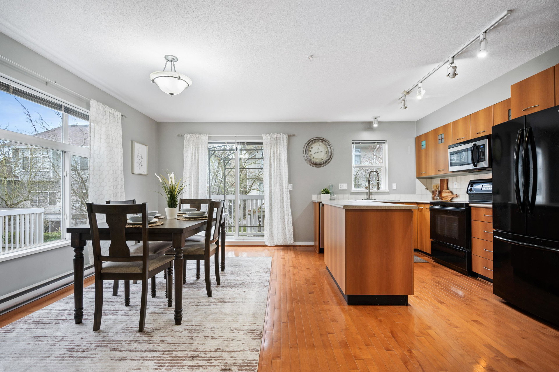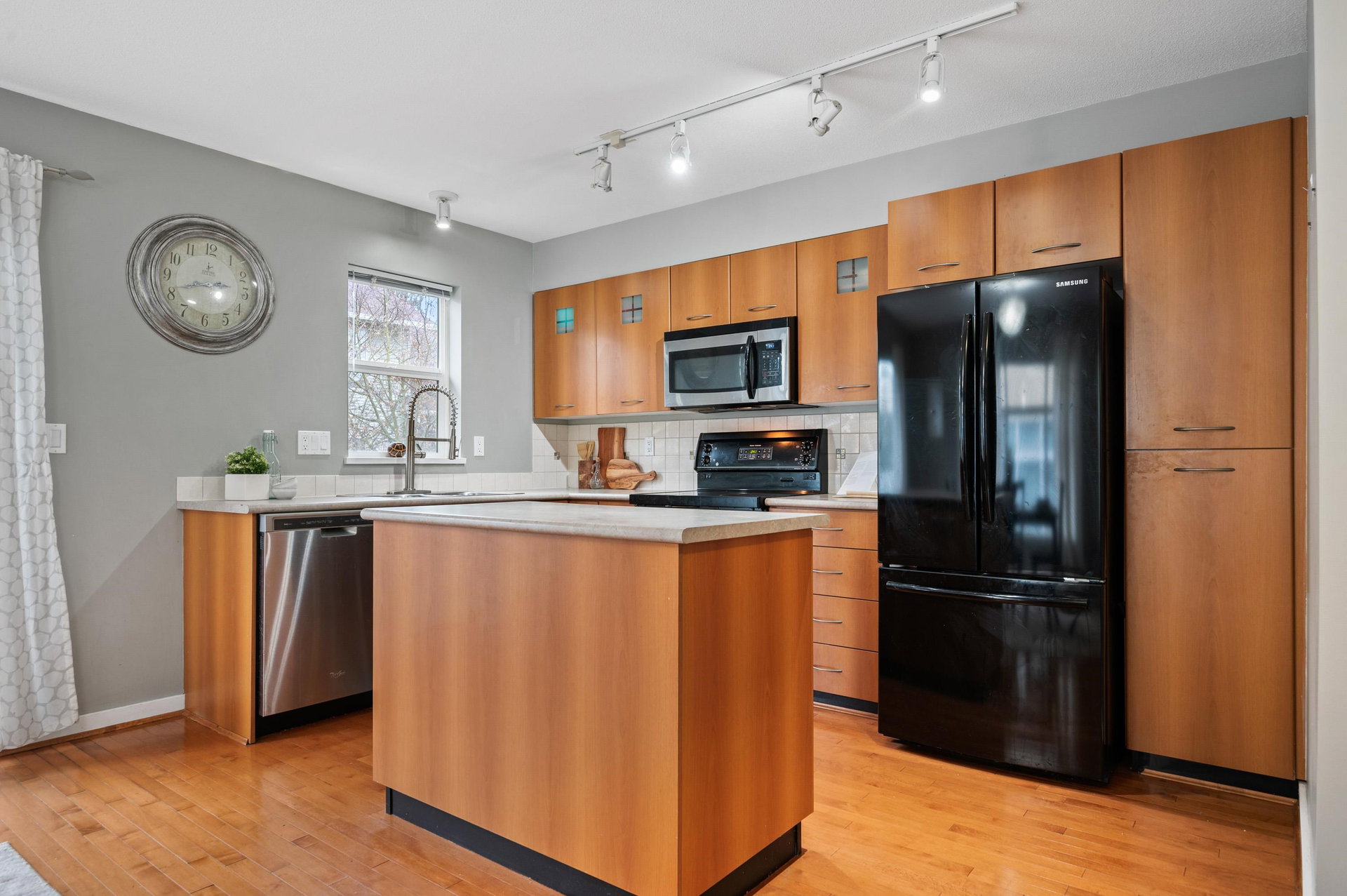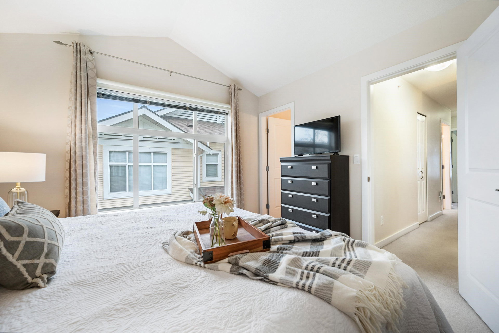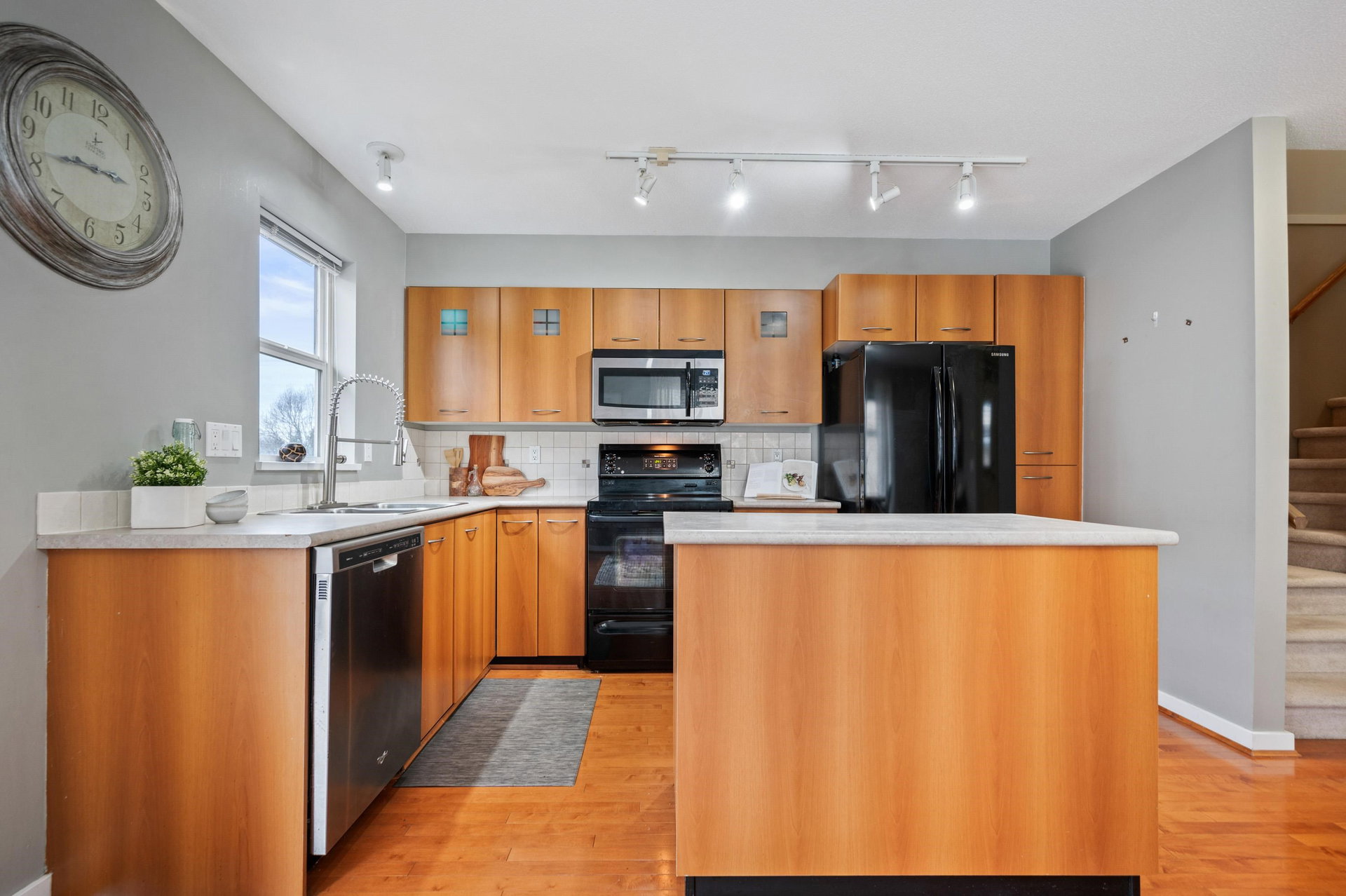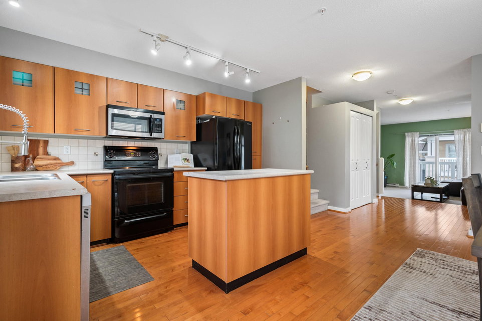 WELCOME HOME to this 3-bed END UNIT located in popular DENIM 1. Enjoy the ease of hardwood floors in the kitchen/dining room which seamlessly flows into a sunken living room, providing an ideal space for relaxation and entertaining, boasting an east-facing deck plus a second, west-facing deck off the kitchen. The master bedroom features a vaulted ceiling, double closets & 4-piece en-suite. Tandem parking plus 3rd open spot in partially covered driveway. Conveniently located near shopping, transit, schools, trails, and with easy highway access, this townhouse offers the perfect blend of comfort and convenience. 2 four-legged animals allowed. No height, weight or breed restriction as per Bylaws. Call today & make this house your new home!